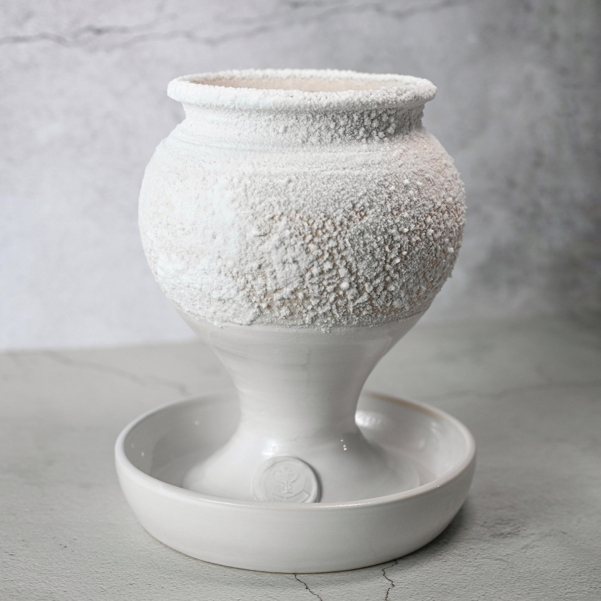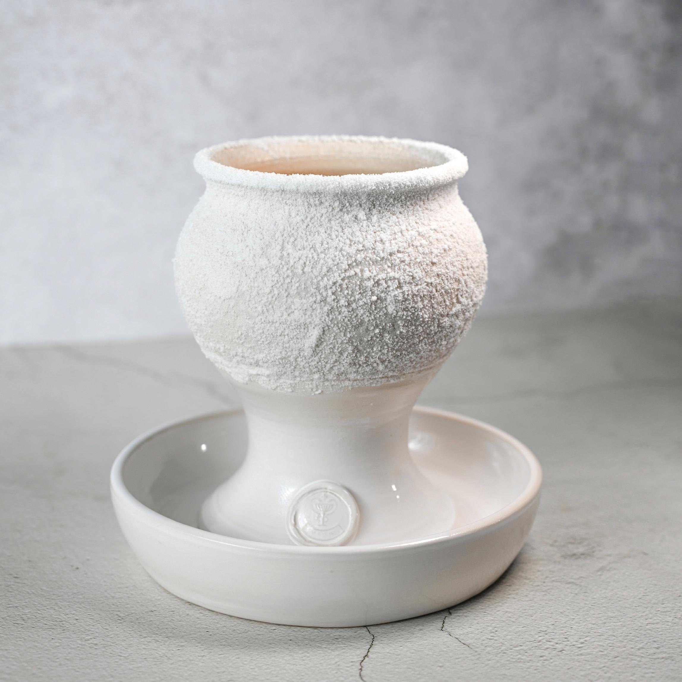 Tumregeln: Saltet ska alltid vara jordfuktigt. Att ytan blir hård över natten är helt normalt – inuti är det vanligtvis tillräckligt fuktigt för att kalken ska fortsätta fungera. Om det samlas vatten i droppskålen, töm den enkelt och minska vattenmängden nästa gång. Rengör skålen regelbundet för att skydda glasyren och fyll vid behov på med salt från ditt förråd.