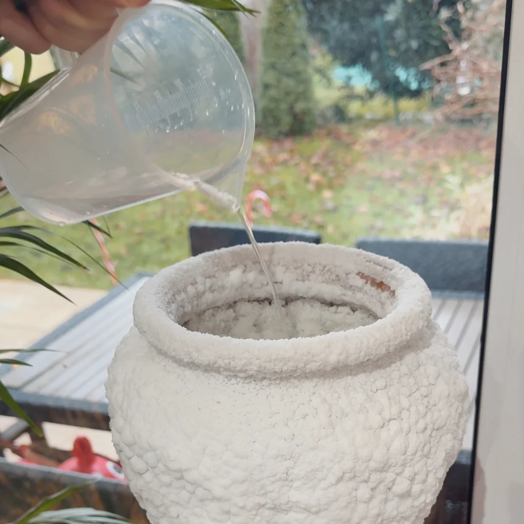 Fyll nu på med mer salt tills nivån ligger cirka 1–2 cm under kanten. Häll ytterligare 100–200 ml vatten över och rör lätt om i de översta 5 cm. Saltet ska till slut vara jordfuktigt – det ska inte stå vatten i kalken. Det återstående medföljande saltet fungerar som reserv för de kommande månaderna.